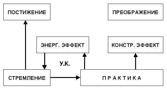Таким образом, блоки стремления, практики и ее энергетического эффекта образуют своего рода "усилительный контур", благодаря которому обеспечивается подкрепление первичного стремления, соответственная перестройка мотивационной сферы и последующее постижение (см. рис.2).