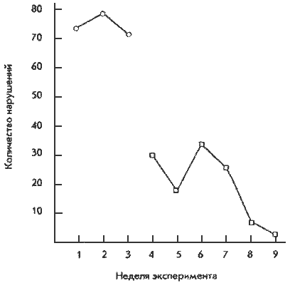 Другие данные, о которых сообщили Этхоу и Краснер, касаются числа нарушений, совершенных пациентами. Обычно многие пациенты в госпитале отказываются утром вставать, умываться или покидать спальню в установленное время, таким образом создавая необходимость в помощи дополнительного персонала. Непосредственно до того, как была введена жетонная система вознаграждения, регистрировалось по одному нарушению в неделю по каждому из этих трех пунктов. В результате в среднем было 75 нарушений (или чуть больше одного на пациента) в неделю. Во время эксперимента жетон выдавали ежедневно, в том случае если не было зарегистрировано нарушения по любому из этих пунктов. Как показано на рис. 7-4, число нарушений снизилось после введения жетонной системы. Исследователи никак не прокомментировали неожиданный рост нарушений (до 39) в течение четвертой недели экспериментальной программы. В течение последних шести месяцев экспериментального периода частота нарушений в среднем составляла девять за неделю (не указано на рис. 7-4).