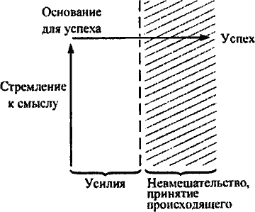Стремление достичь успеха напрямую оборачивается погоней за миражом. Условием и предпосылкой для настоящего результата, основанием для успеха является "обходной путь": взаимодействуя с различными обстоятельствами и ситуациями, человек поступает осмысленно, утверждая свои ценности.