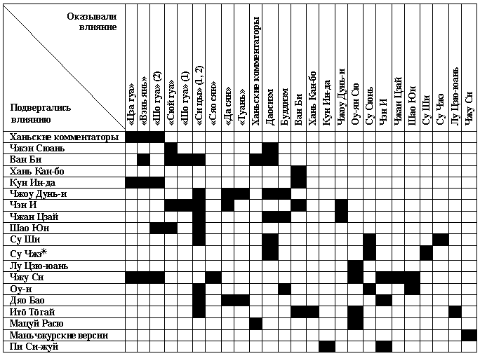 Из этой схемы видно, какую большую роль играл Ван Би как звено, связующее трактаты из "Десяти крыльев" с сунской (в данном случае философской) школой комментаторов. Поэтому необходимо указать хотя бы на некоторые прототипы его комментария, находимые в "Си цы чжуани" и "Шо гуа чжуани" (1).