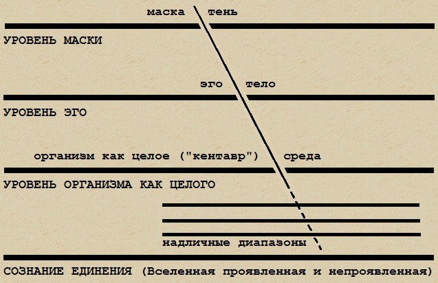 Итак, от всего мироздания до части мироздания, называемой "организмом"; от организма до части организма, называемой "эго"; от эго до части эго, называемой "маской" таковы некоторые из диапазонов спектра сознания. На каждом последующим уровне спектра все больше и больше аспектов Вселенной представляются человеку внешними для его "я". Так, на уровне организма по ту сторону границы оказывается окружающая среда, она становится чуждой ему, внешней, превращается в "не-я". А на уровне маски таковой становится и окружающая среда, и тело человека и некоторые стороны его собственной психики.
